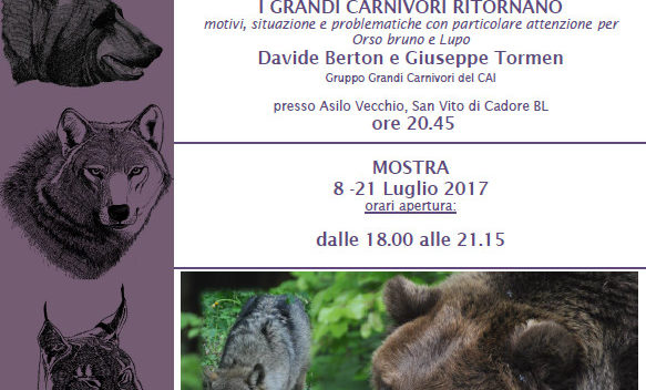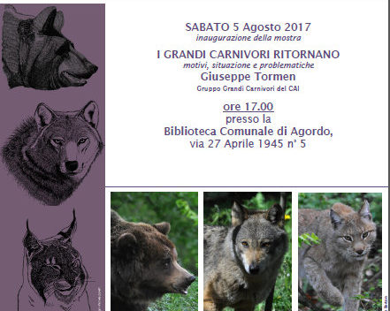 Il 5 agosto inaugura a Agordo (BL) la mostra “Presenze Silenziose – ritorni e nuovi arrivi di carnivori sulle Alpi“ presso la Biblioteca Comunale di Agordo (BL), in Via 27 aprile 1945 n. 5 con un incontro dal titolo “I grandi carnivori ritornano: motivi, situazione e problematiche” a cura di Giuseppe Tolmen del Gruppo Grandi Carnivori del Club Alpino Italiano.