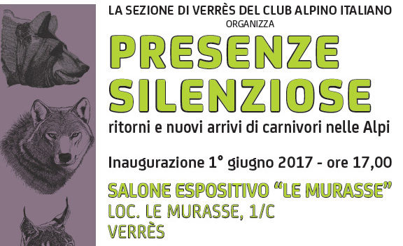 LA SEZIONE DI VERRÈS DEL CLUB ALPINO ITALIANO ospita la mostra “PRESENZE SILENZIOSE ritorni e nuovi arrivi di carnivori nelle Alpi” Inaugurazione 1° giugno 2017 – ore 17,00 SALONE ESPOSITIVO “LE MURASSE” LOC. LE MURASSE, 1/C, VERRÈS Dal 2 all’8 giugno 2017 Dalle ore 17,00 alle ore 20,00 – tutti i giorni anche i festivi *Apertura