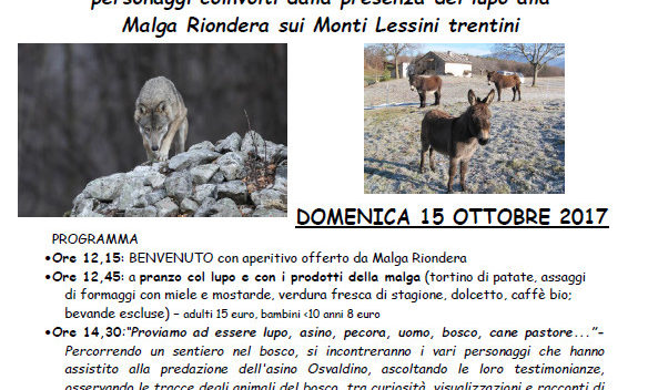 Nel contesto dell’iniziativa “Terre di Lupi”, il Bioagriturismo Malga Riondera propone una domenica all’insegna del lupo nella cornice affascinante dei Monti Lessini. Domenica 15 ottobre 2017, l’evento “Attenti al lupo?” propone un pranzo e una una passeggiata-intervista – adatta a grandi e piccini – con i personaggi coinvolti dal ritorno del lupo in Lessinia.  Qui il programma della giornata, con tutte